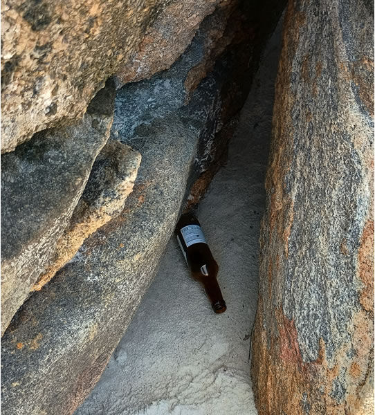Olhando a praia de relance, ela não parece muito suja, mas é um olhar enganoso, pois há muita sujeira inorgânica escondida espalhada pelos mais diversos caminhos, reentrâncias de pedra e até mesmo na areia. Infelizmente. Garrafas de vidro e cacos de outras garrafas foram os objetos mais perigosos que encontramos. Também, camisinhas usadas e muitos lenços do tipo umedecidos revelaram que uma das regras pétreas do naturismo está sendo